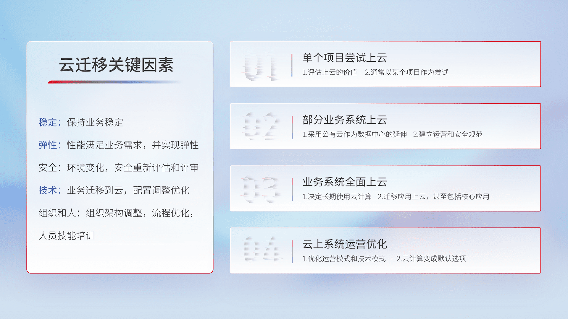 结合实际业务,,,从规划设计、、、云平台选型、、、云原生改造、、数据迁移、、、集成交付,,迁移全过程为客户识别最佳上云路径,,,,做好风险识别管理,,设计网络架构、、身份权限、、安全审计合规、、、操作审计、、日志审计、、、、监控告警策略、、、、多站点容灾设计等,,,对云上基础设施进行整体规划,,,,提升IT治理水平,,以满足弹性、、高可用、、高性能的需求。。