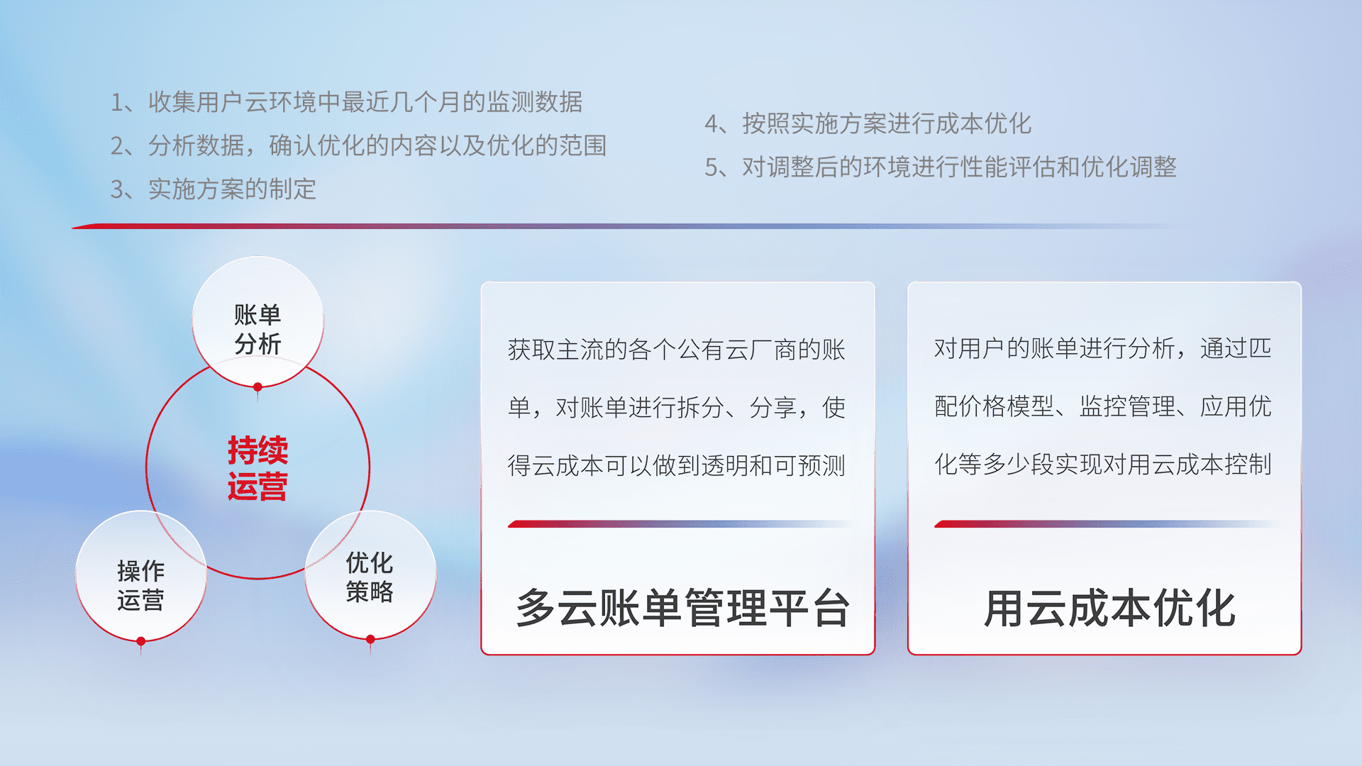 通过多云纳管,,以统一的资源数据模型把客户的云资源进行抽象和封装,,进而实现对多云资源的统一操作,,,,保障云资源管理的可靠性、、、稳定性与可用性。。。量身定制化运维内容,,配置、、、、开发运维、、补丁管理、、、备份、、监控、、、认证和访问管理、、、审计和日常巡检等,,保障在用云过程中的可靠度,,,,稳定度以及高可用率。。